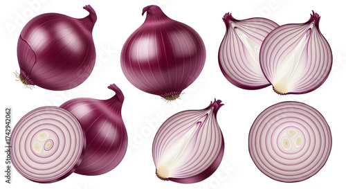 Set of Whole, Halved, and Sliced Red Onions Isolated on White Background