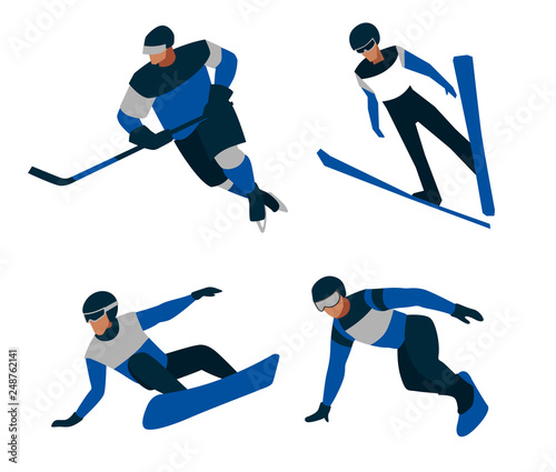 Set of winter sports figures. Dark blue sports uniform. Vector graphics