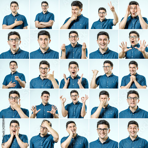 adult, amazed, angry, background, beautiful, casual attire, caucasian, character, cheerful, collage, collection, different, diverse, emotion, excited, expression, face, facial, fun, gesture, goggles, grimace, group, photogenic, happy, hipster, humor, informal, isolated, joyful, laugh, male, man, mosaic, multiple, negative, people, person, portrait, positive, sad, serious, set, smile, surprised, unhappy, variation, white, young