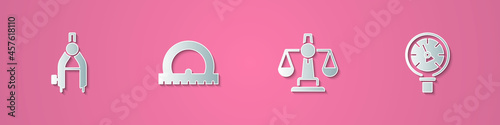 Set paper cut Drawing compass, Protractor, Scales of justice and Pressure water meter icon. Paper art style. Vector