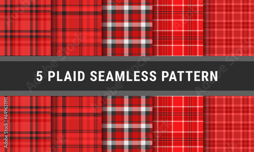 Set Plaid Seamless Pattern In Red Black White. Tartan Checkered Fabric Texture