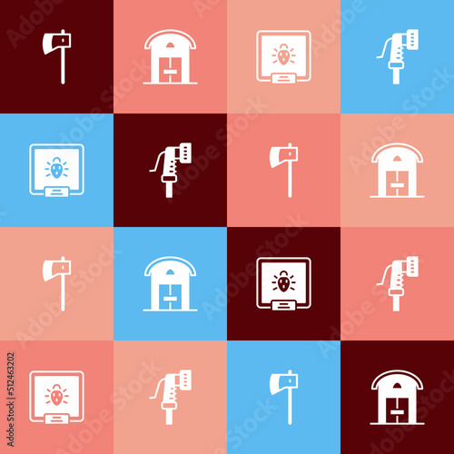 Set pop art Wooden axe, Farm house, Colorado beetle and Garden hose icon. Vector