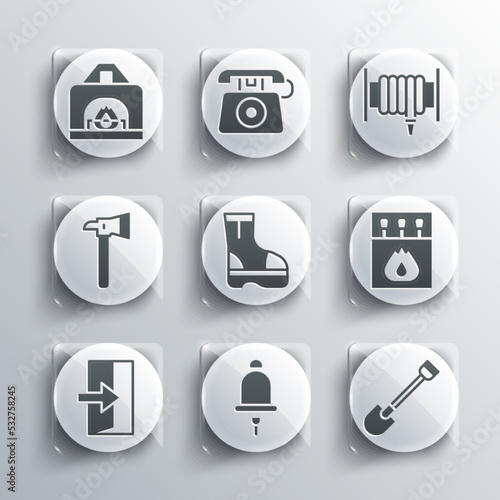 Set Ringing alarm bell, Fire shovel, Matchbox and matches, boots, exit, Firefighter axe, Interior fireplace and hose reel icon. Vector