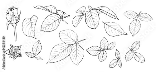 Set. Rose flowers and leaves. Illustration sketch in black and white style. Vector
