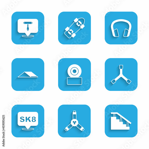 Set Skateboard wheel, Y-tool, stairs with rail, park, Headphones and T icon. Vector