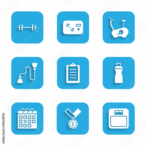 Set Sport training program, Medal, Bathroom scales, Fitness shaker, Calendar fitness, Chest expander, Stationary bicycle and Barbell icon. Vector