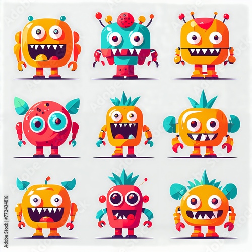 Set, Vibrant Flat Design: Playful Exaggerations of Colorfull Monsters, fruits and love