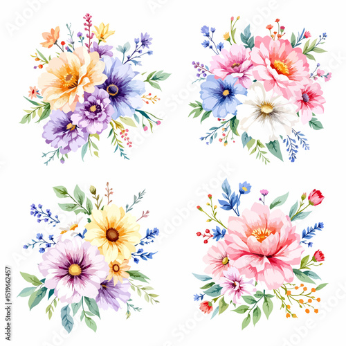 Set Watercolor bouquet colorful flowers on white background, Watercolor bouquet