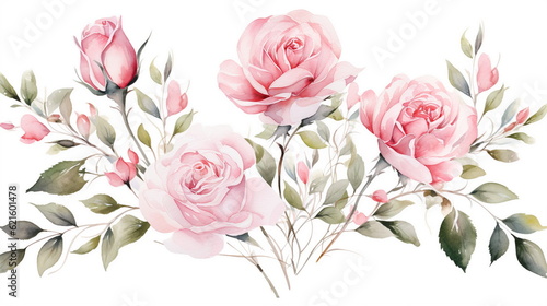 set watercolor elements of pink roses; collection garden flowers; leaves; branches. Botanic; illustration, eucalyptus Wedding floral design, white background