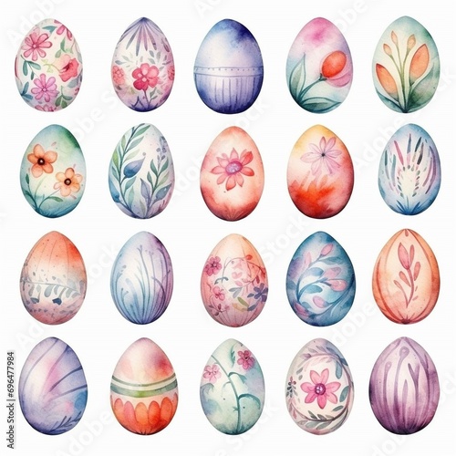 Set with colorful watercolor handmade Easter eggs on white background, 20 eggs icon for app
