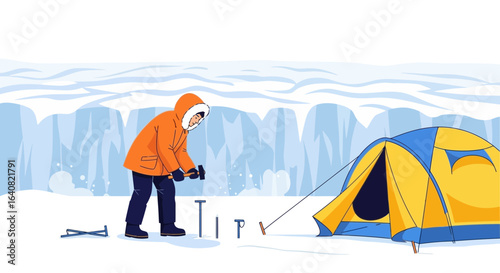 camping, adventure, cold, snow, glacier, tent, hammering, peg, person, extreme, winter, weather, travel, tour tourism, frosty, scene, outdoors, activity, anorak, nature, landscape, backpacking, trekking, ice, glacé, journey, exploration, hiker, excursion, holiday, vacation, recreational vehicles, campground, arctic, antarctic, environment, equipment, gear, preparation, setting, up