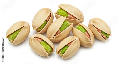 Seven pistachio nuts scattered casually, with their light beige shells partially open to reveal bright green kernels inside