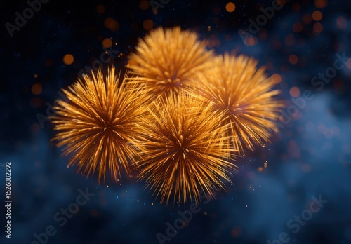 Several bursts of golden fireworks illuminate the dark sky. Celebration, festive, holiday, new year, anniversary, event, party, show, night, bright