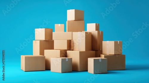 Several cardboard boxes are neatly stacked against a vivid blue background creating a visually appealing arrangement. This display highlights storage or shipping concepts in a contemporary design.