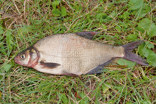 Several common bream fish on green grass. Catching freshwater fi