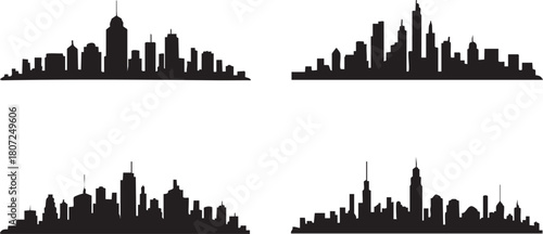 Several different cityscapes present in black silhouettes display the variety of modern urban skylines transparent