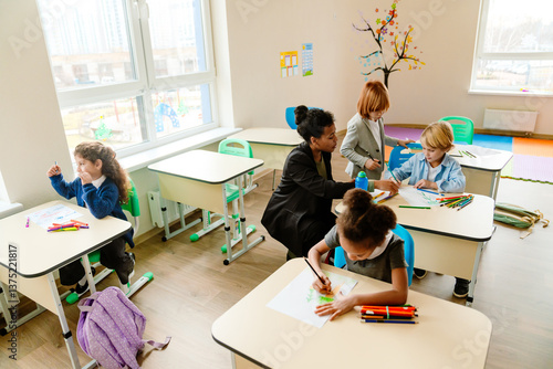 latino, female, teacher, diverse, elementary, student, classroom, desk, drawing, art, supply, colourful, furniture, decoration, guidance, activity, marker, paper, boy, woman, learning, school, education, shelf, creativity, window, poster, sharpened, teaching, girl, light, bright, teamwork, interaction, children, wall, modern, indoor