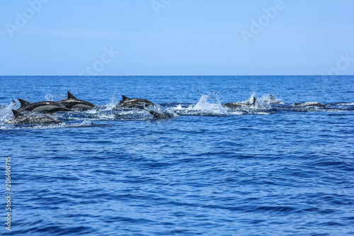 Several dolphins jumping and swimming off the coast of La Paz and close to Isla Espiritu Santo in Baja California, Mexico.