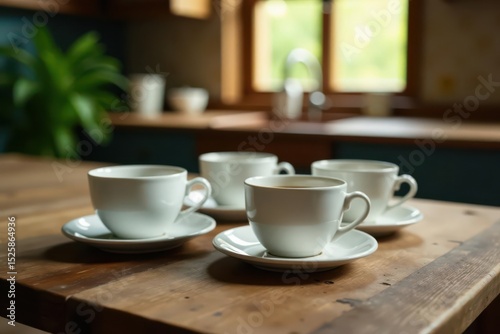 Several empty coffee cups on a rustic kitchen table , objects, rustic