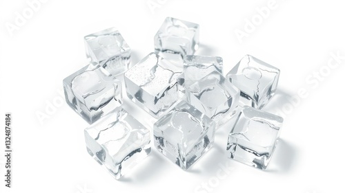 Several glistening ice cubes on a stark white background, winter, minimalism