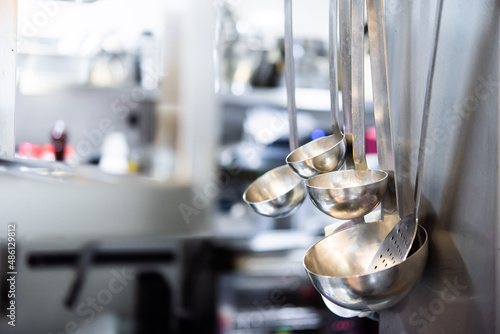 Several ladles stacked on a shelf in a professional restaurant kitchen prior to service. chef