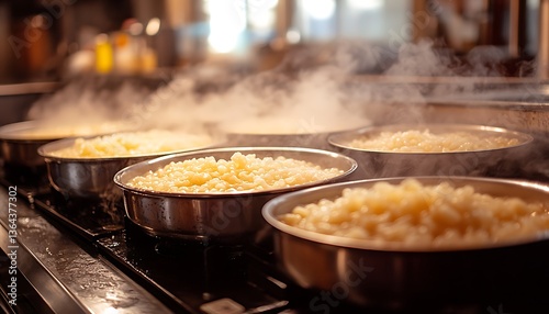 cooking, food, kitchen, eatery, steam, metal, bowl, pan, container, hot, warm, preparation, meal, dish, yellow, gold, grain, shallow, depth, sharpened, cookery, cookery, boiling, process, heat, energy, delicious, fresh, ready, serving, quantity, large, indoor, surface, clean, black, light, blurry, background, soft, grainy, natural, bright, appetising, texture, culinary