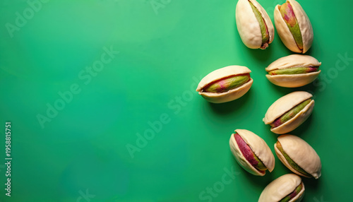 Several pistachio nuts with shells on vibrant green background. Nuts arranged diagonally from top right to bottom left. Pistachio displays pale shell, bright green kernel inside. Image ideal for food