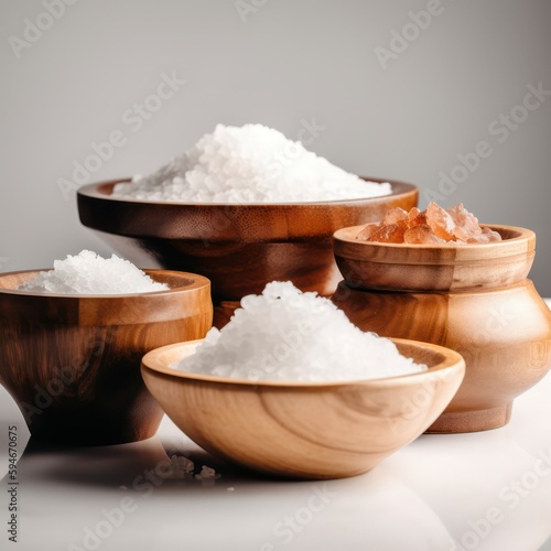 Several types of salt in wooden bowls on the table. Himalayan, Hawaiian, table, sea salt. Generative AI