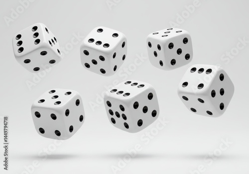 Several white dice with black spots are suspended in mid-air against a plain, light gray background