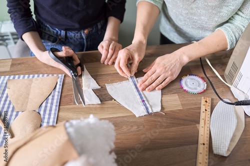 Sewing process close-up. Hands of woman and daughter sewing