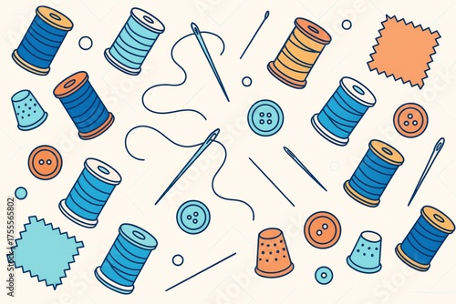 sewing, pattern, tool, background, light, creative, fabric, buttons, needle, thread, textile, craft, stitch, spool, patch, clothes, threaded, tailor, colourful, hand-made, fashion, hobby, scissors, material, embroidery, decor, art, design, needlecraft, quilting, simple, minimal, seamless, abstract, flat, hobbyist, apparel, icon, cut-out, composition, garment, minimalistic, stylish, ai, generative, illustration