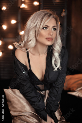 Sexy blonde woman portrait in black shirt and lingerie. Beautiful fashion blond girl model over bokeh lights dark background. Alluring female with makeup and curly hair style posing on bed.