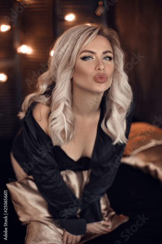 Sexy blonde woman portrait in black shirt and lingerie. Beautiful fashion blond girl model over bokeh lights dark background. Alluring female with makeup and curly hair style posing on bed.