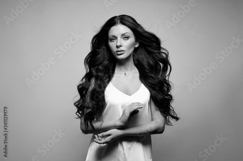Sexy fashion woman with long hair, curly strong hair of a brunette girl. Natural cosmetics for hair care, strong roots