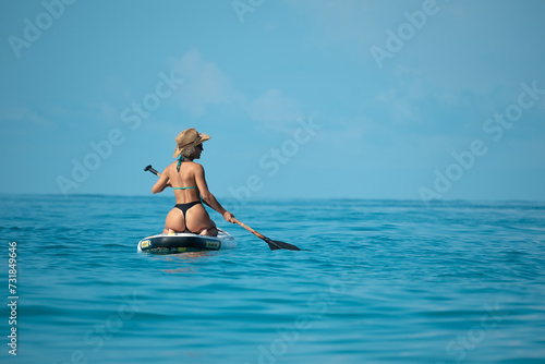 sexy girl in a swimsuit on a sup board lies resting on a board under the bright sun on the background of the sea , Stand up paddleboarding