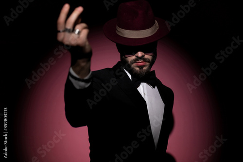 attractive, background, black, bow tie, bow tie, burgundy, business, businessman, cap, dramatic, elegant, fashion, finger, goggles, hand, photogenic, hat, holding, looking, male, man, model, mysterious, people, pink, posing, sexy, studio, suit, sunglasses, tuxedo, wearing, young