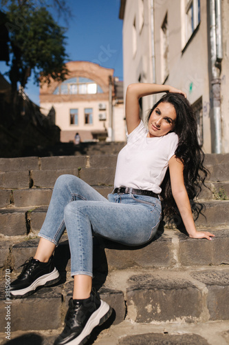 Sexy woman in denim sits on stairs in the city. woman with beautiful smile