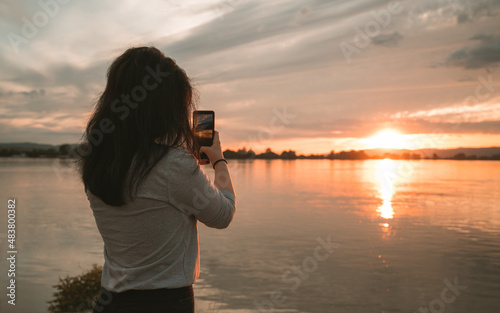 Sexy woman photographed from behind at sunset. She photographs the Danube at sunset.