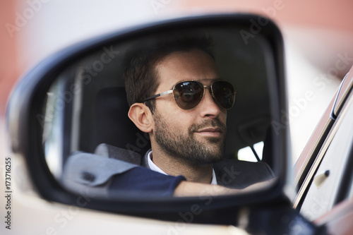 horizontal, photo, color image, outdoors, day, one person, photogenic, half face, looking away, content, collar, contemplation, closeup, stubble field, suit jacket, car, driving, wing mirror, sunglasses