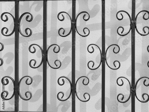 closeup, curve, decoration, fence, gate, iron, ironwork, metal, ornate, protection, shadow, sharp, sunlight, wall, art, design, light, cement, concrete, white, pattern, background, grey