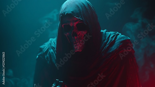 shadowed, grim, reaper, glowing, skeletal, feature, flowing, dark, robe, illuminated, eerie, tone