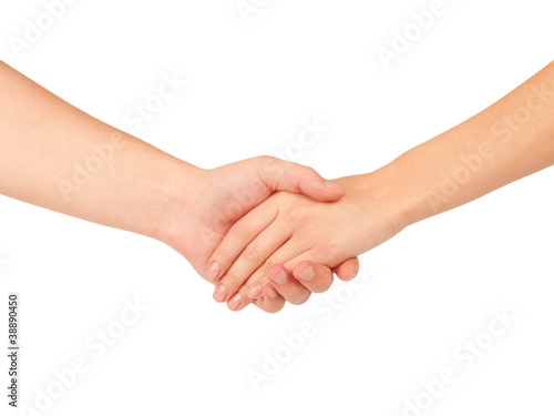 Shaking hands of two people, man and woman, isolated on white.