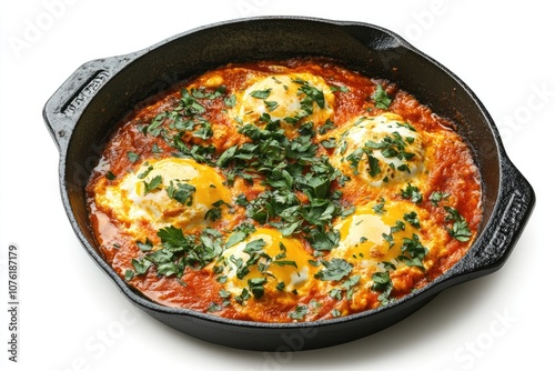 egg, tomatoes, sauce, parsley, frying pan, plaster bandage, iron, white, background, breakfast, brunch, dish, food, cookery, mediterranean, middle, eastern, savoury, spicey, hot, delicious, flavorful, hearty, healthy, protein, yolk, red, green, orange, yellow, cooking, meal, dinner, lunch, fresh, garnished, garnishing
