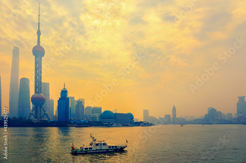 Shanghai skyline in sunny morning with cloud sky, misty and Huangpu river cityscape view