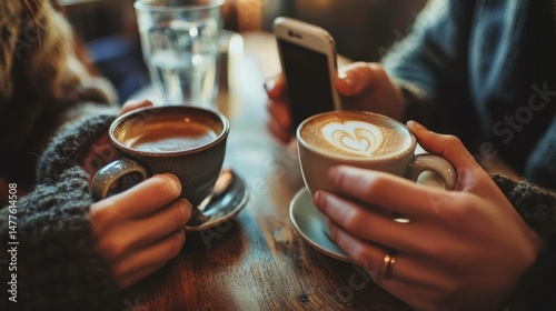 hot drink, hand, cafes, beverage, cappuccino, cup, table, drink, together, sharing, lifestyle, relaxation, wooden, warming, communication, caffeine, break, mug, espresso, latte, nubes, foam, delicious, aromatic, holding, enjoyment, mobile, indoor, sweater, chatting, resting, conversation, acquaintance, togetherness, digital, device, social, connection, engagement, simple, pleasure, modern, friendship