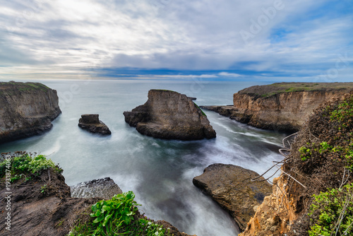 Shark Fin Cove along the California coast featuring dramatic layered rock formations and sea stacks rising from the Pacific Ocean. Long exposure captures smooth water and rugged coastal geology