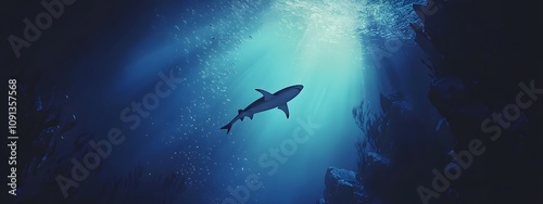Shark swimming in the deep blue ocean, surrounded by shimmering light and silhouetted fish in the background