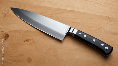 Sharp chef's knife on wooden cutting board, high-quality image for culinary websites or magazines.