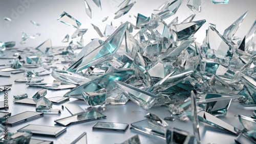 sharp, jagged, shard, transparent, broken, glasses, scattered, across, pristine, unblemished, perfectly, lit, white, background, surface, fragment, piece, shattered, crystal, delicate, fragile, menacing, dangerous, hazardous, harmful, brittle, semitransparent, opacity, clarity, radiance, illumination, highlight, shadow, texture, pattern, formation, disorder, mess, disarray, chaos, whiteness, purity, cleanliness, simplicity
