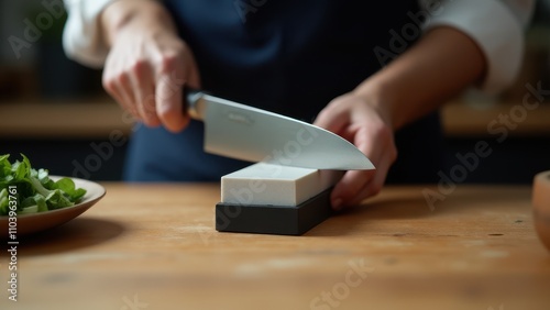 Sharpening stone for kitchen knives. A hand expertly sharpens a chef's knife on a whetstone atop a wooden table, ensuring the blade is keen and ready for use.